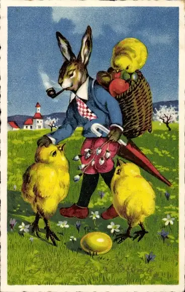 Ak Frohe Ostern, Osterhase mit Pfeife, Küken, Ostereier