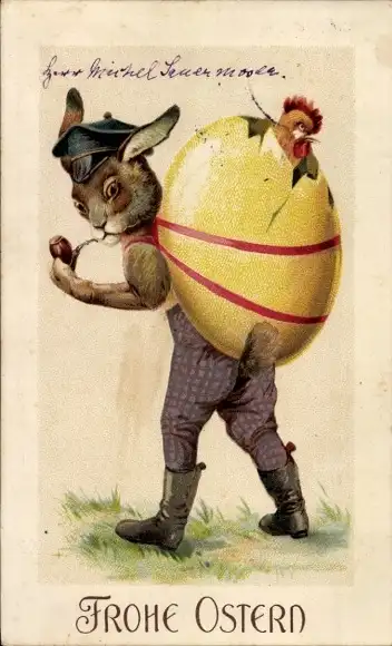 Ak Frohe Ostern, Osterhase mit Pfeife trägt Osterei, Huhn