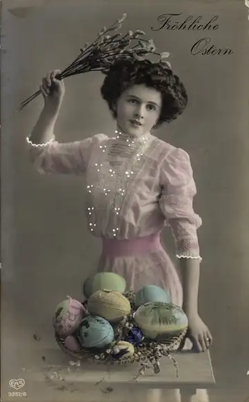Ak Frohe Ostern, junge Frau mit einem Korb voller Ostereier, Weidenkätzchen, coloriert