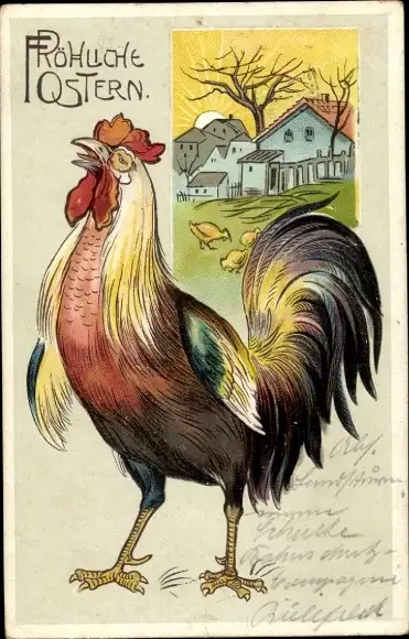 Ak Frohe Ostern, krähender Hahn