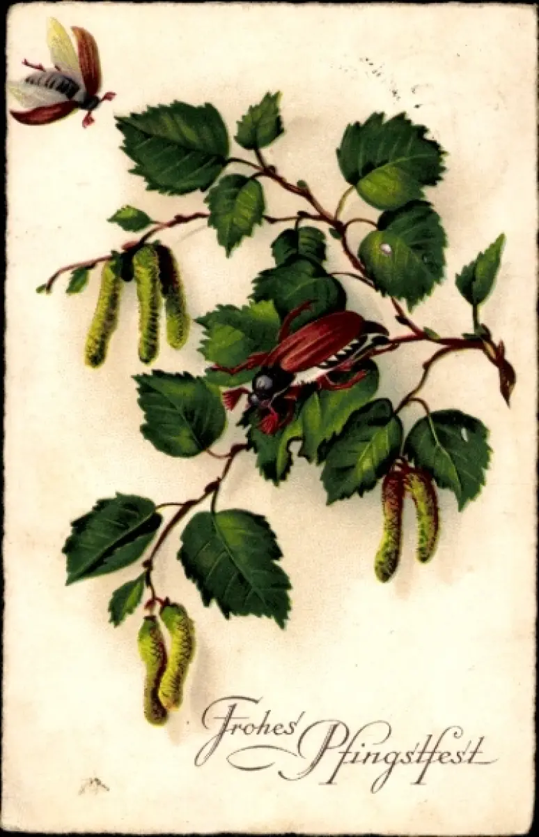 Ak Frohe Pfingsten, Maikäfer auf einem Birkenzweig