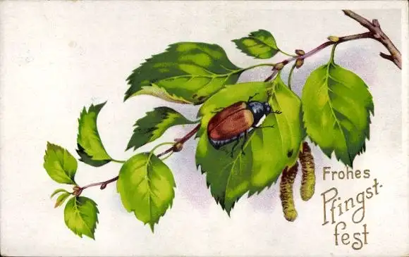 Ak Frohe Pfingsten, Maikäfer sitzt auf einem Blatt, Birke
