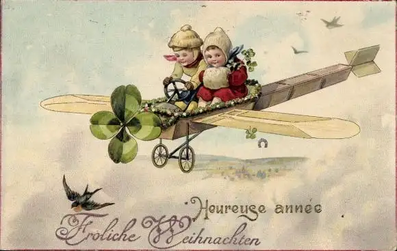 Ak Frohe Weihnachten, Fröhliches Neujahr, Kinder im Flugzeug, Kleeblatt, Schwalbe