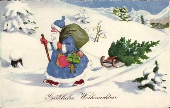 Ak Frohe Weihnachten, Weihnachtsmann, Schlitten mit Tannenbaum