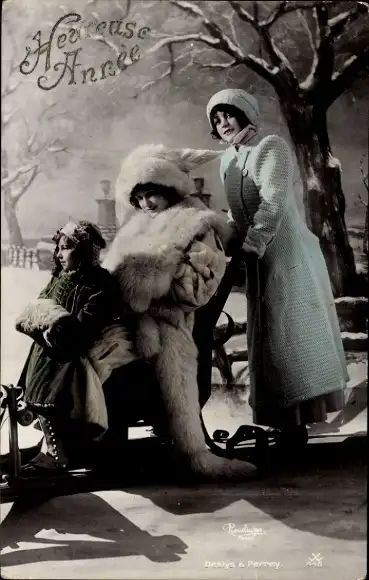 Ak Frohes Neujahr, Frauen mit Schlitten