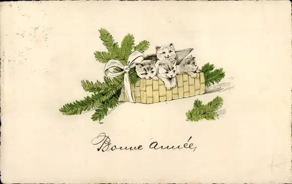 Ak Frohes Neujahr, Katzen in einem Spankorb