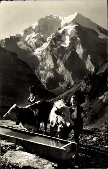 Ak Frutigen Kanton Bern, Am Bergbrunnen auf Allmenalp mit Balmhorn Altels, Rinder