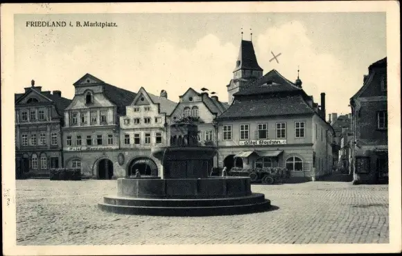 Ak Frýdlant v Čechách Friedland Reg. Reichenberg, Marktplatz, Brunnenanlage