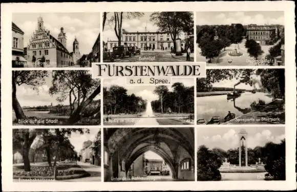 Ak Fürstenwalde an der Spree, Bahnhof, Denkmalsplatz, Stadtpark, Rathaus, Ehrenmal