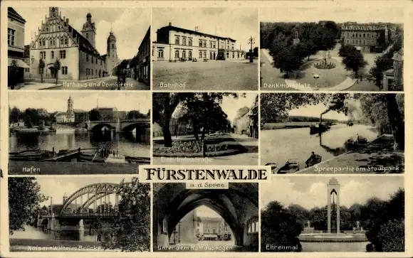 Ak Fürstenwalde an der Spree, Rathausbogen, Ehrenmal, Hafen, Domkirche, Bahnhof