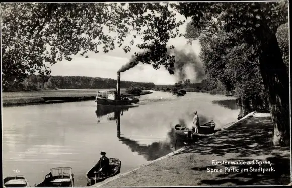 Ak Fürstenwalde an der Spree, Spree-Partie am Stadtpark, Dampfschiff, Schleppzug, Ruderboote