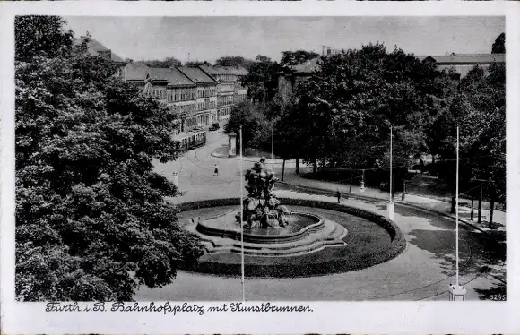 Ak Fürth in Mittelfranken Bayern, Bahnhofsplatz mit Kunstbrunnen