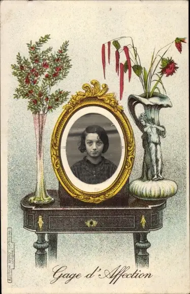 Ak Gage d'Affection, Blumen in den Blumenvasen, Mädchen-Portrait