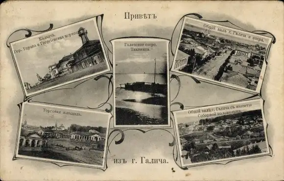 Ak Galitsch Russland, Kirche, See, Markt, Gesamtansicht