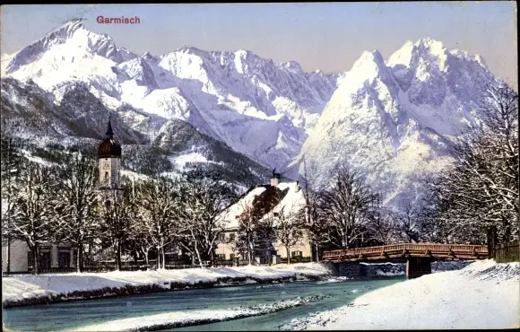 Ak Garmisch Partenkirchen in Oberbayern, Teilansicht, Alpen, Winter, Brücke, Kirche