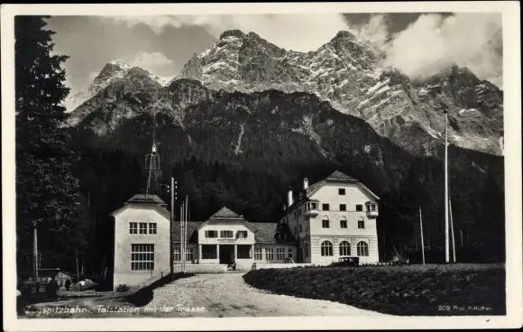 Ak Garmisch Partenkirchen in Oberbayern, Zugspitzbahn, Talstation mit der Trasse