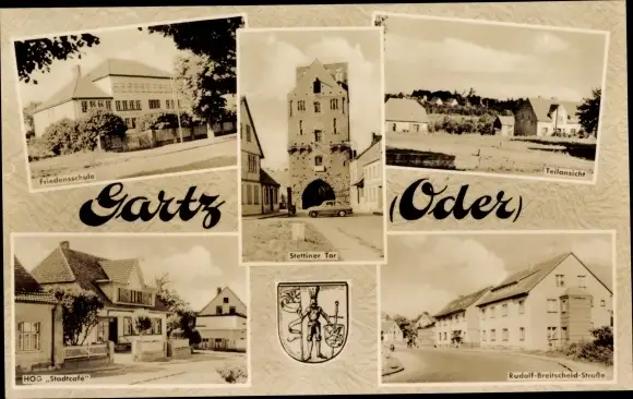 Ak Gartz an der Oder, Stettiner Tor, Friedensschule, HOG Stadtcafe, Wappen