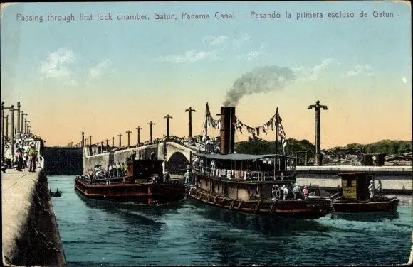 Ak Gatun Locks, Panama Canal, Esclusas de Gatun, first lock chamber, Dampfer in der Schleuse