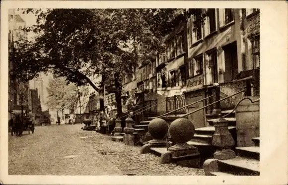 Ak Gdańsk Danzig, Altstadtstraße, Häuserfront, Laternen, Straßenansicht