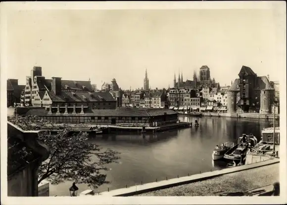 Ak Gdańsk Danzig, Ansicht des Hafens mit Krantor, Marienkirche, viele Schiffe