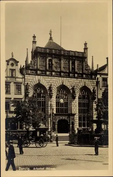 Ak Gdańsk Danzig, Artushof, historische Architektur, Stadtansicht, Personen, Pferdekutsche
