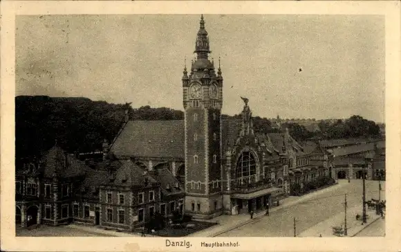 Ak Gdańsk Danzig, Danzig Hauptbahnhof, Turm mit Uhr, historische Architektur