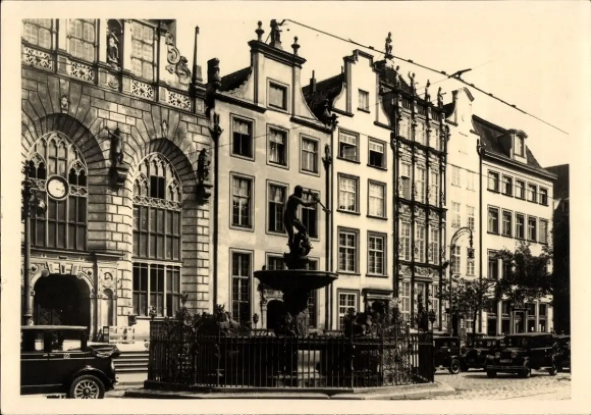 Ak Gdańsk Danzig, Danzig Langgasse, Brunnen, Gebäude, Autos