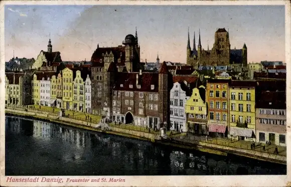 Ak Gdańsk Danzig, Frauentor, Kirche St. Marien, Flusspartie