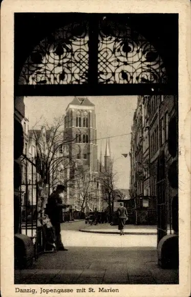 Ak Gdańsk Danzig, Jopengasse mit St. Marien-Kirche, Tordurchblick
