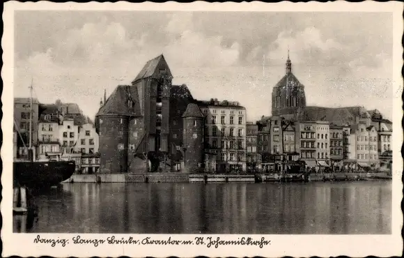 Ak Gdańsk Danzig, Krantor, Lange Brücke, Johanneskirche
