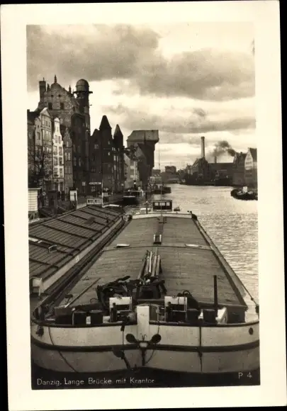Ak Gdańsk Danzig, Lange Brücke, Krantor, Sternwarte, Frachtschiff