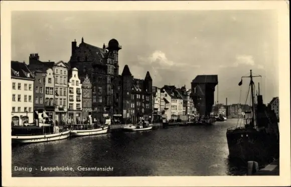 Ak Gdańsk Danzig, Langebrücke, Gesamtansicht, Krantor, Sternwarte, Mottlau
