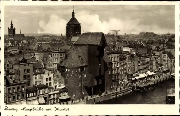 Ak Gdańsk Danzig, Langebrücke mit Krantor, St. Marienkirche, Hebekran im Hintergrund