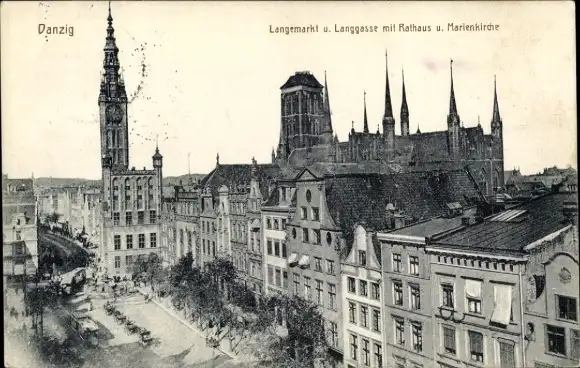 Ak Gdańsk Danzig, Langemarkt, Langgasse, Rathaus, Marienkirche