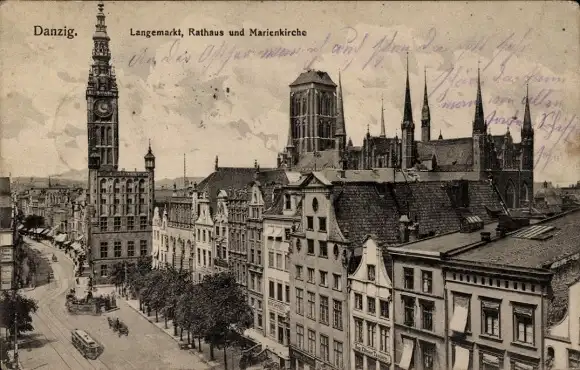 Ak Gdańsk Danzig, Langemarkt, Rathaus, Marienkirche