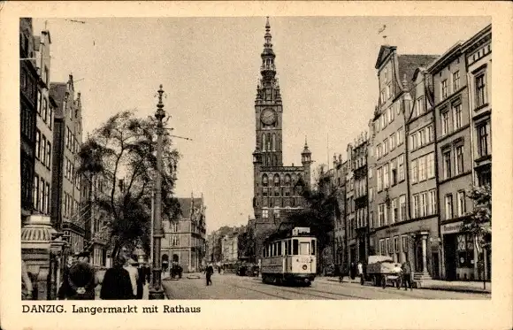 Ak Gdańsk Danzig, Langer Markt mit Rathaus, Straßenbahn