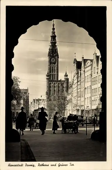 Ak Gdańsk Danzig, Rathaus, Grünes Tor, Straßenbahn