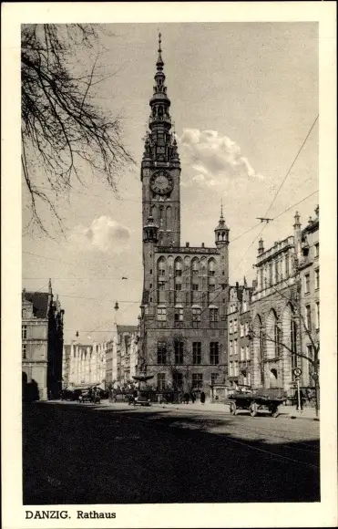 Ak Gdańsk Danzig, Rathaus mit Turmuhr, Umgebung, Autos