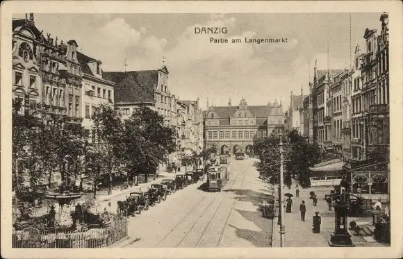 Ak Gdańsk Danzig, Schwarzweißaufnahme, Langenmarkt, historische Gebäude, Straßenbahn