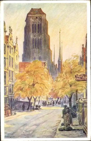 Ak Gdańsk Danzig, St. Marien Kirche, Jopengaffe, alte Bäume, Stadtansicht