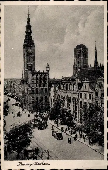 Ak Gdańsk Danzig, Straßenpartie mit Blick auf das Rathaus, Autos