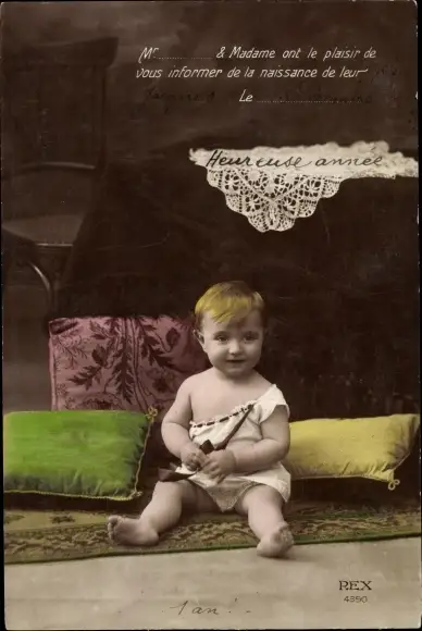 Ak Geburtsanzeige, Kleinkind mit Pfeife