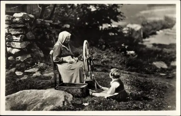 Ak Geiranger Norwegen, Junge schaut auf Frau mit Spinnrad