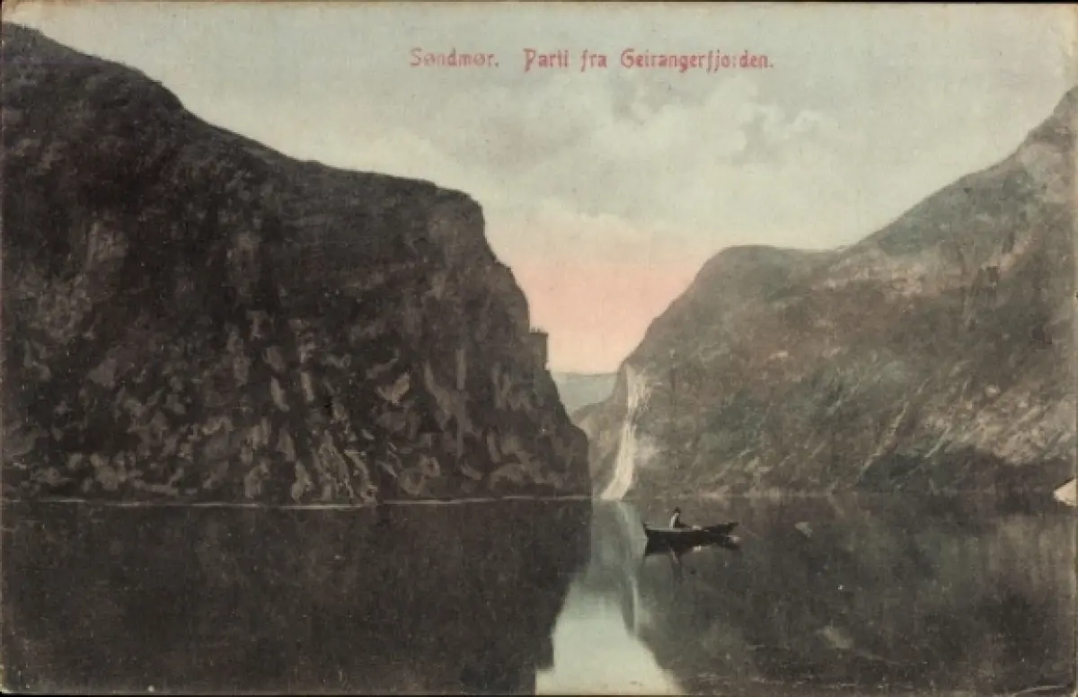 Ak Geirangerfjord Norwegen, Bergige Landschaft, Boot auf dem Wasser, Text: Sandmor. Parti fra Gei