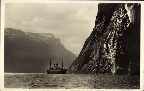 Ak Geirangerfjord Norwegen, Schleierwasserfälle, Dampfer