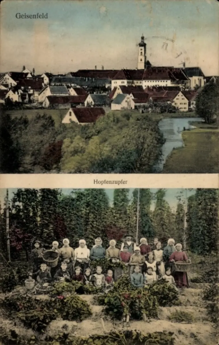 Ak Geisenfeld an der Ilm, Teilansicht, Hopfenzupfer
