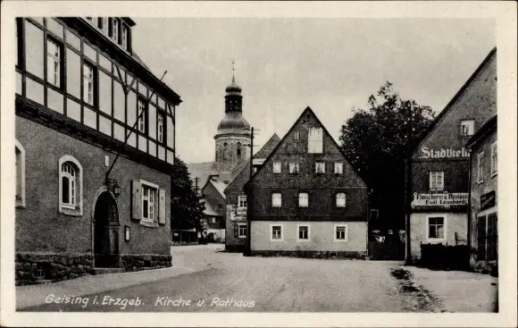 Ak Geising Altenberg Erzgebirge, Kirche und Rathaus, Fleischerei