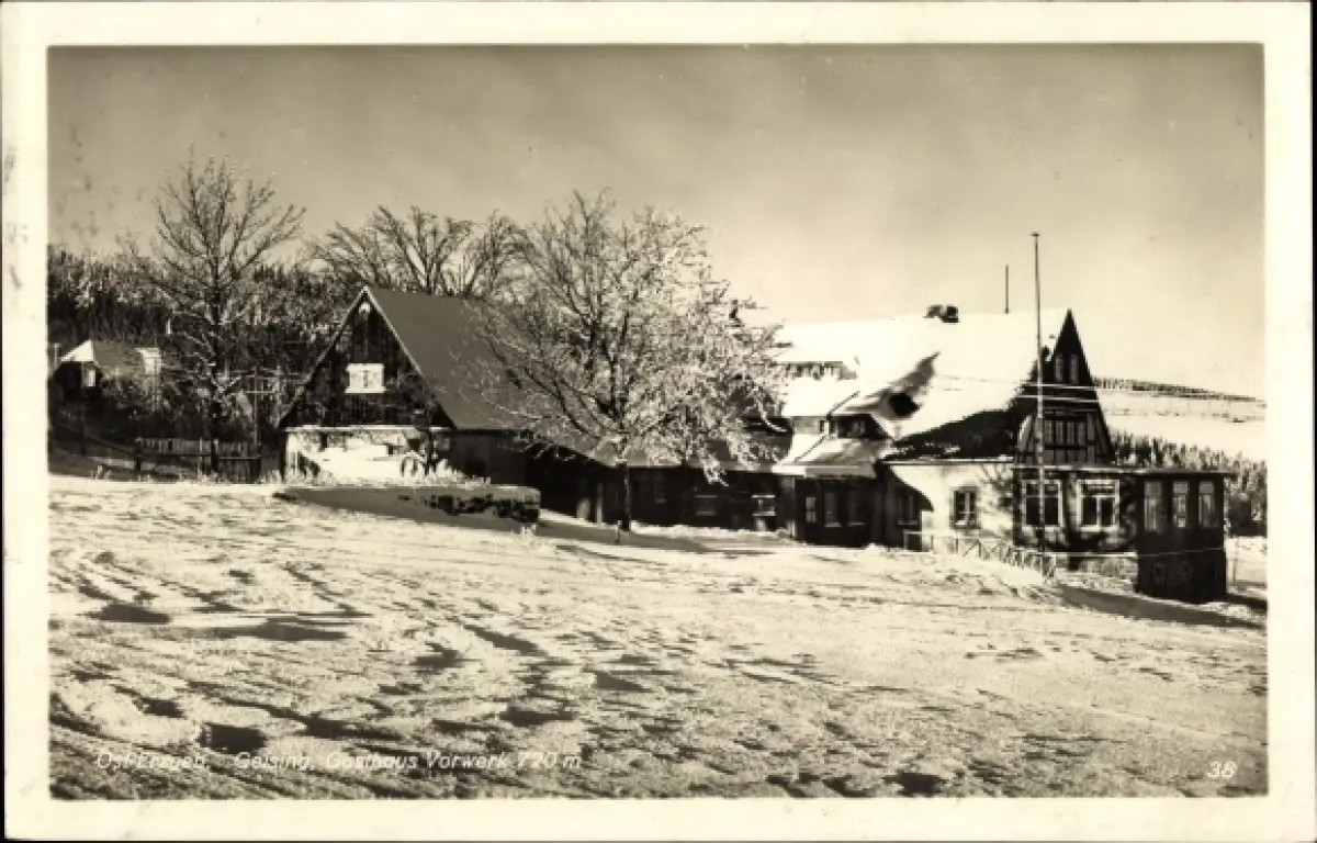 Ak Geising Altenberg im Erzgebirge, Teilansicht, Winter, Gasthaus Vorwerk