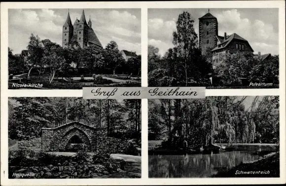 Ak Geithain in Sachsen, Nikolaikirche, Pulverturm, Schwanenteich, Heilquelle