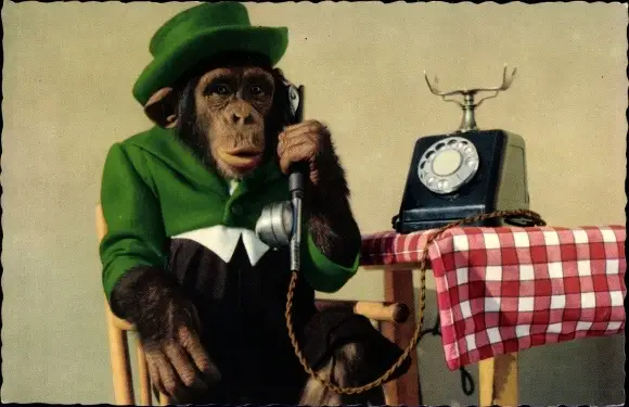 Ak Gekleideter Schimpanse beim Telefonieren, Telefon